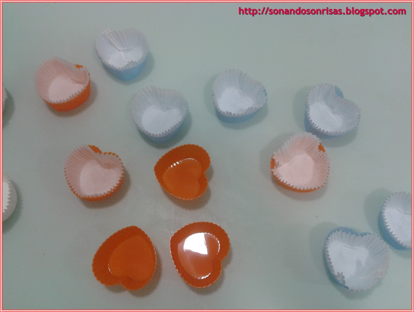 Utilicé unos moldes de silicona en forma de corazón, para protegerlos puse unos papeles para las magdalenas los cuales tuve que dar un poco de forma para que se adaptaran a los corazones.