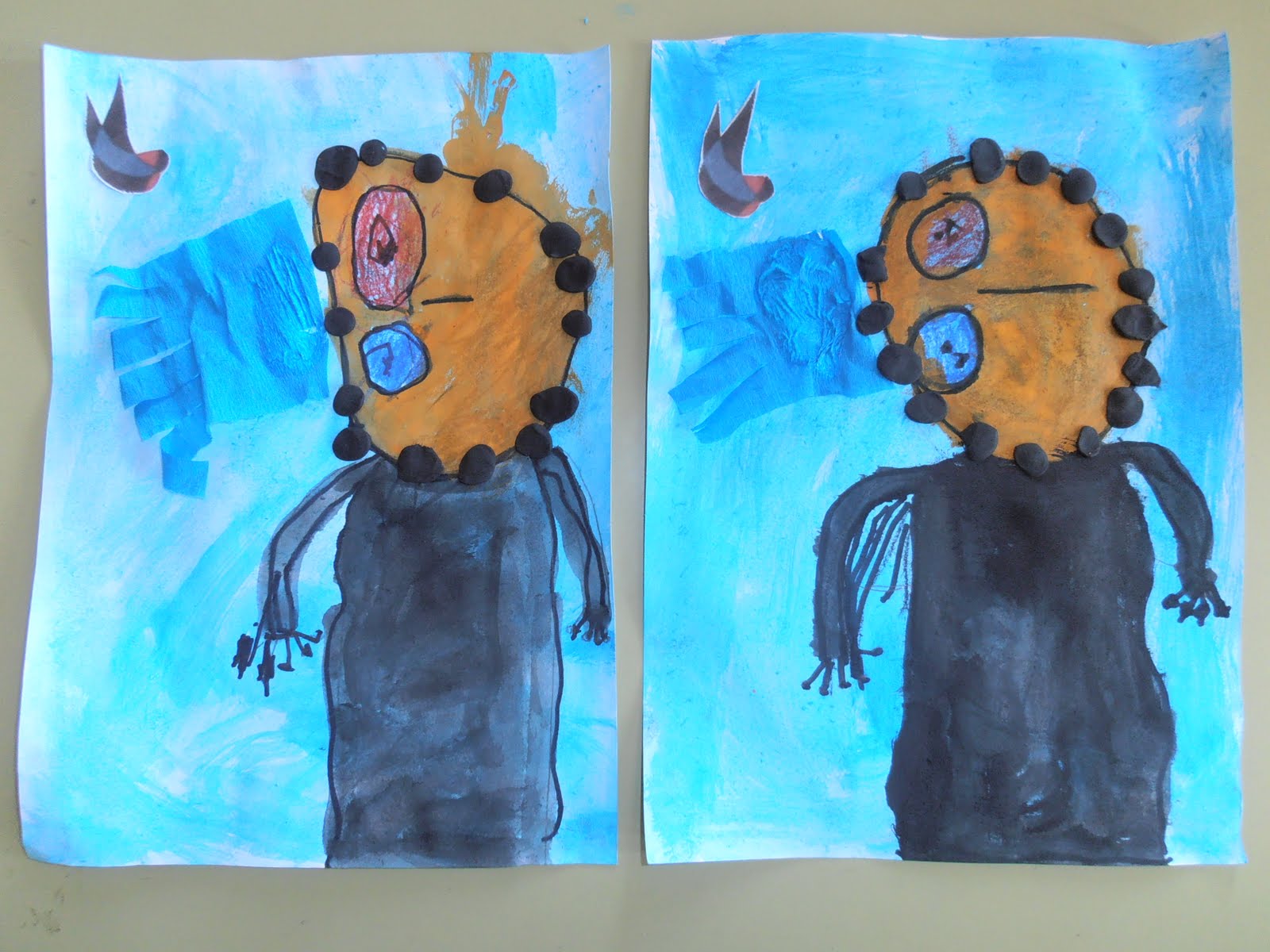 Y para los circulitos alrededor de la cabeza, han hecho bolitas de plastilina negra, y luego las han pegado con sus deditos.