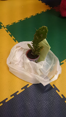 Al día siguiente, la dragona tragona que sigue con nosotros, nos trajo una nota acompañada de un cactus. Se ha enterado que vamos a aprender cosas de África y nos ha traído una planta que crece en el desierto por lo que necesita poca agua.