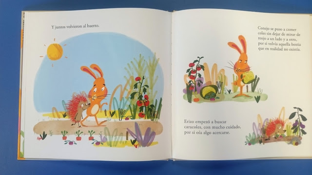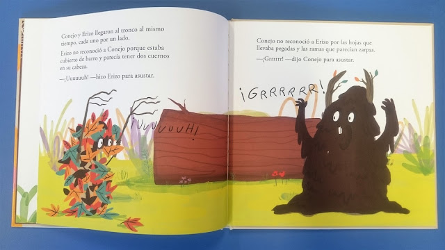 Así que erizo decide disfrazarse con hojas y ramas para asustar a ese monstruo, y conejo decide asustar llenándose de barro.