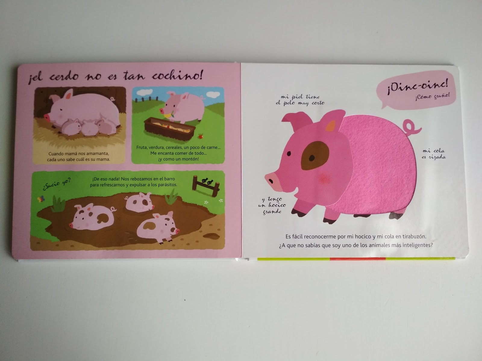 Lo ideal de estos cuentos es que además de que son animales que siempre interesan mucho al niño y aprenden sus onomatopeyas, están hechos con texturas, muchas partes de las páginas tienen diferentes texturas para poder tocar.