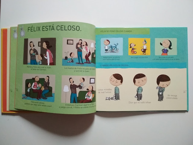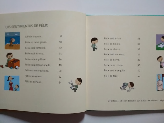 Félix a lo largo del cuento nos pone ejemplos para entender cada emoción, y además nos cuenta cómo se pone su cara al sentirse así. Los niños empatizan con un niño como él y nos facilita comprender las diferentes emociones que trabaja y hablar sobre ellas.