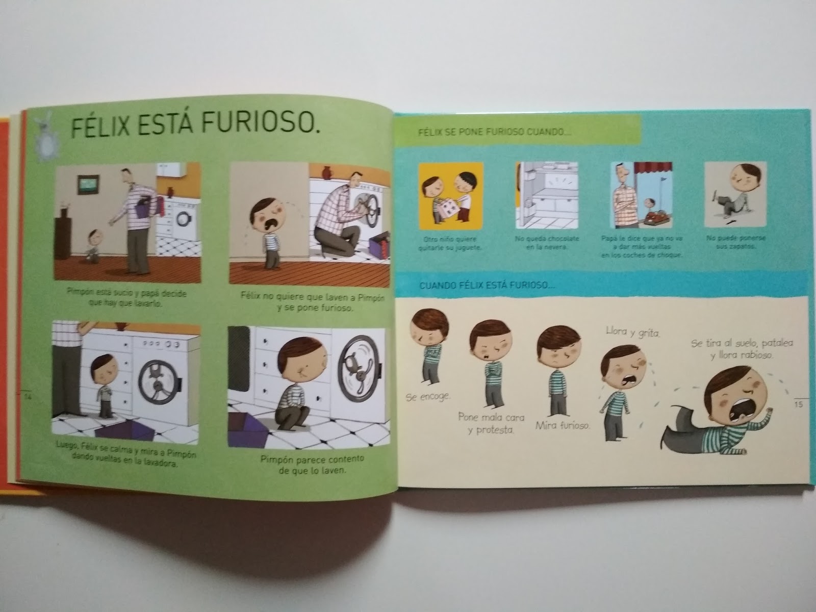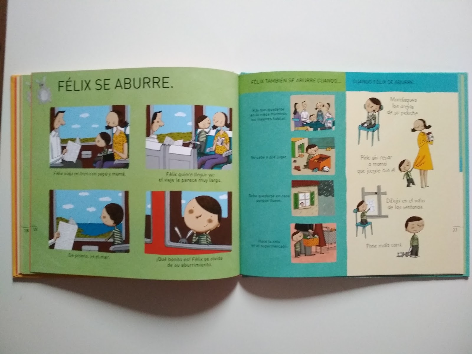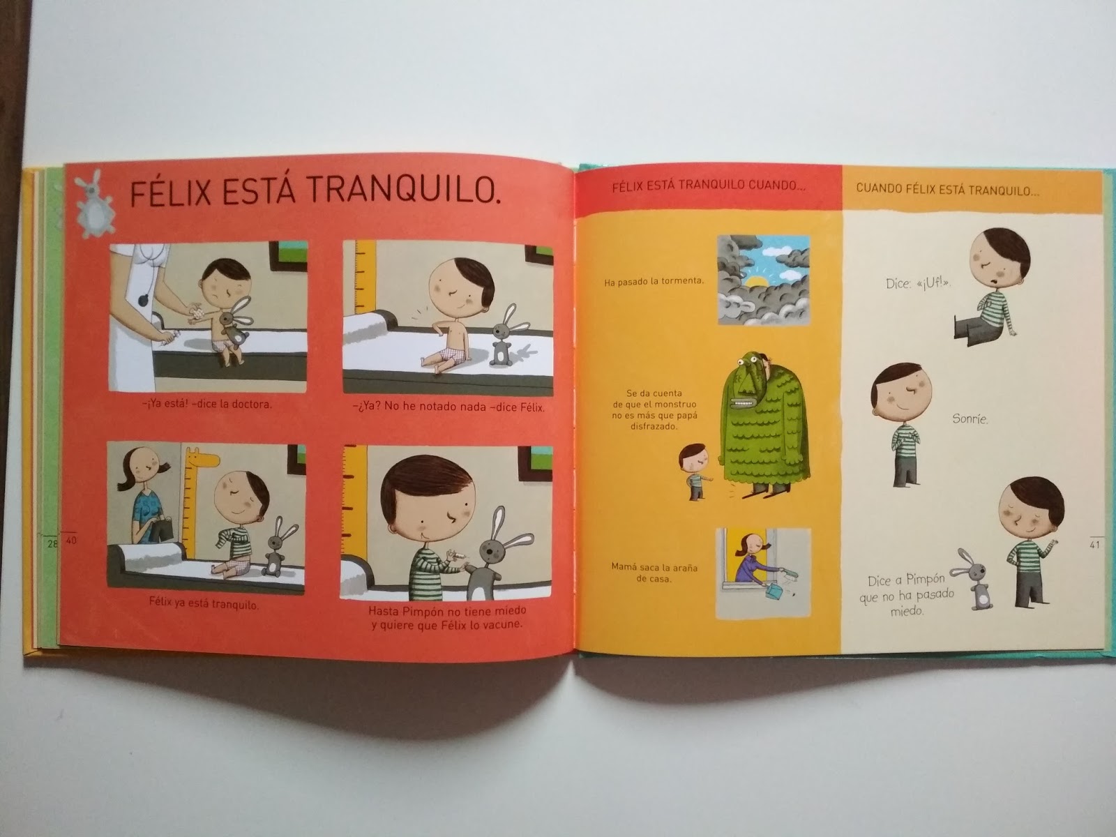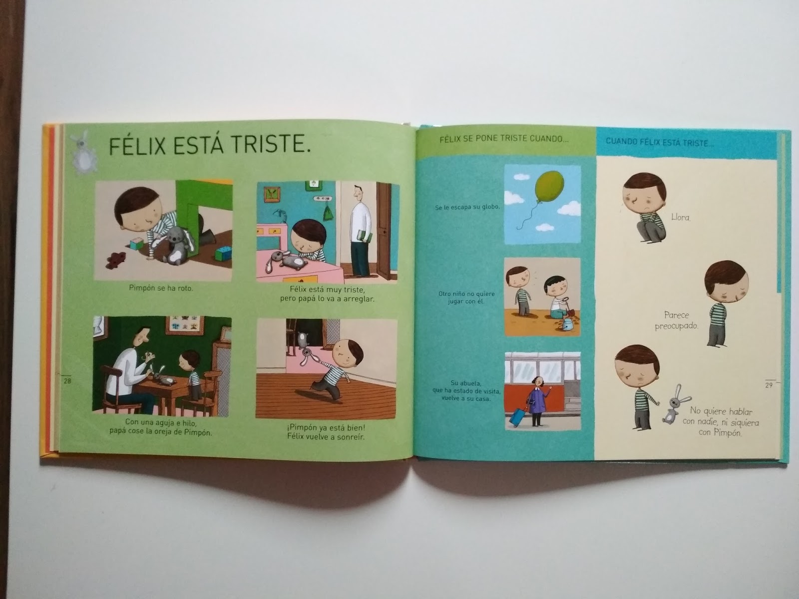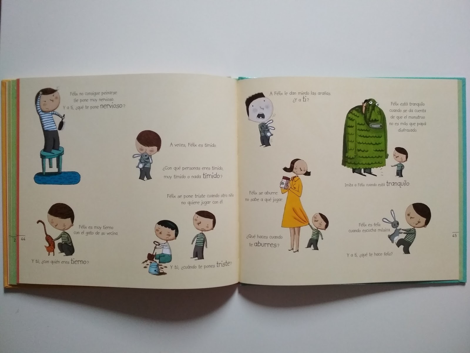 Félix a lo largo del cuento nos pone ejemplos para entender cada emoción, y además nos cuenta cómo se pone su cara al sentirse así. Los niños empatizan con un niño como él y nos facilita comprender las diferentes emociones que trabaja y hablar sobre ellas.
