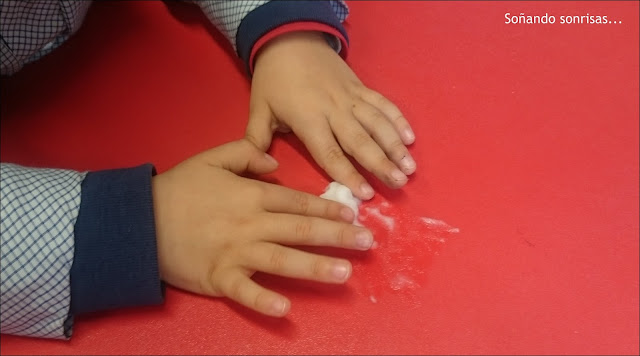 Eramos muchos así que tuvimos que repartirla. No tengo muchas fotos del momento porque estuvimos disfrutando, tocándola, intentando hacer mini muñecos de nieve… y os aseguro que quedaron todas las mesas llenitas de «nieve».