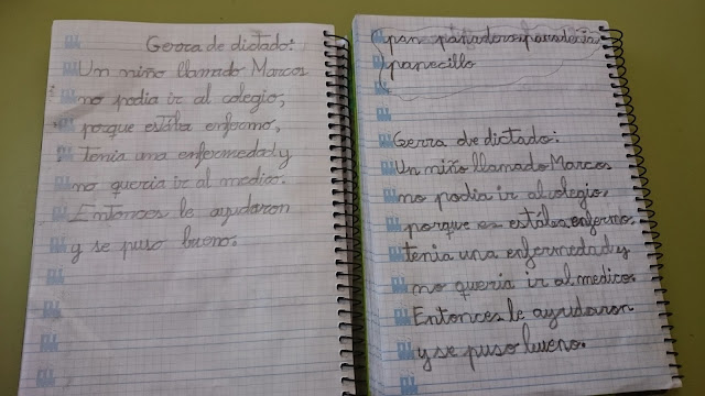Cuando ya todos hemos dictado y nos han dictado, nos intercambiamos los papeles y cada uno, con un boli en la mano corrigen el dictado de su compañero con el modelo suyo correcto, esto les encanta!!