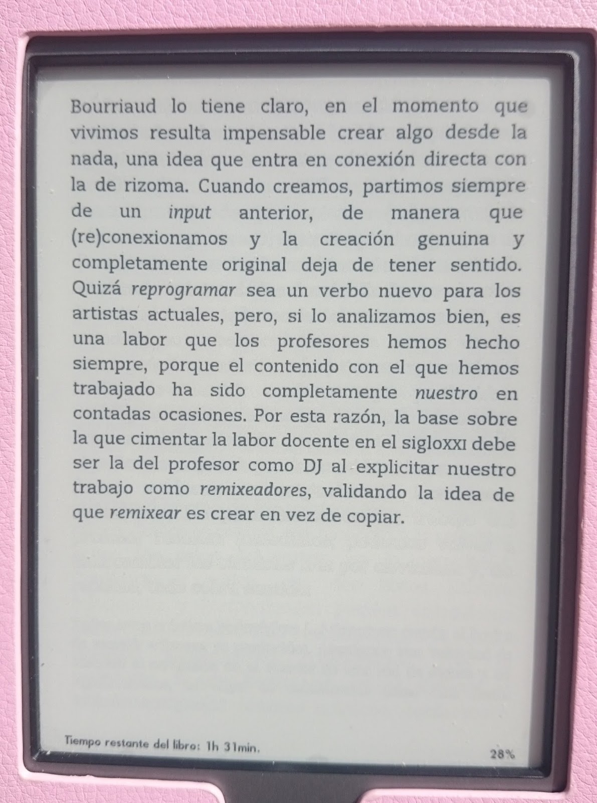 Y luego, su contenido. Es un libro muy cómodo de leer, muy ameno, y con una información muy interesante de cómo se produce el conocimiento de manera rizomática, a través de rizomas, de uniones con lo que nos han aportado otros. Es decir, no creamos nada nuevo, ni tampoco copiamos, si no que reproducimos a nuestra manera las influencias de los demás. Algo similar, dice la autora, a lo que hace un DJ, que reproduce una lista de sus canciones favoritas, no está copiando, pero tampoco inventando.