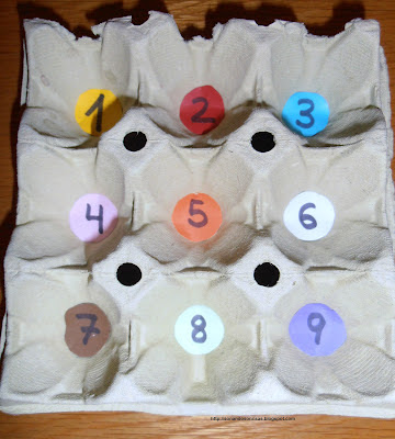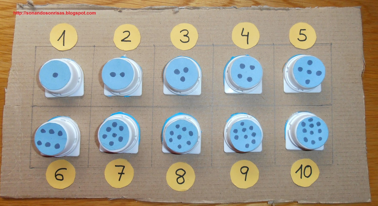 Esta hecho con tapones de leche y una base de cartón o madera. Para realizar este tablero tenemos dos opciones; esta que he elegido yo, en la que seguimos asociando la cantidad con la grafía, además de trabajar la psicomotricidad fina al enroscar y desenroscar los tapones, y otra opción en la que pondríamos los números directamente en los tapones, así la actividad consistiría en ordenar los números, saber cual es el qué falta, etc.