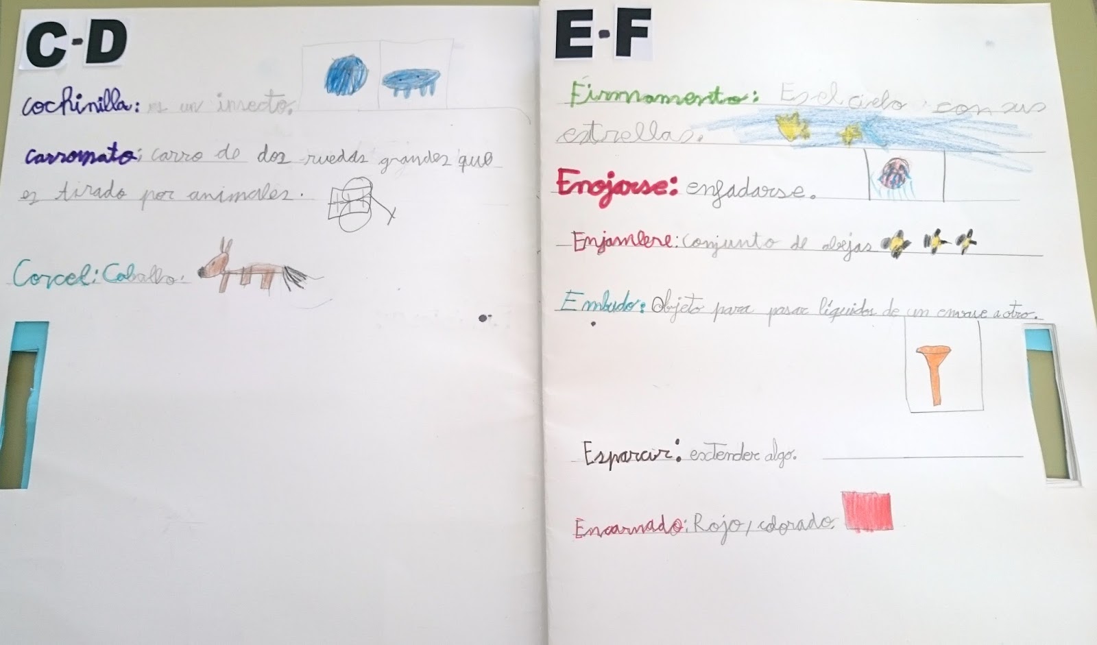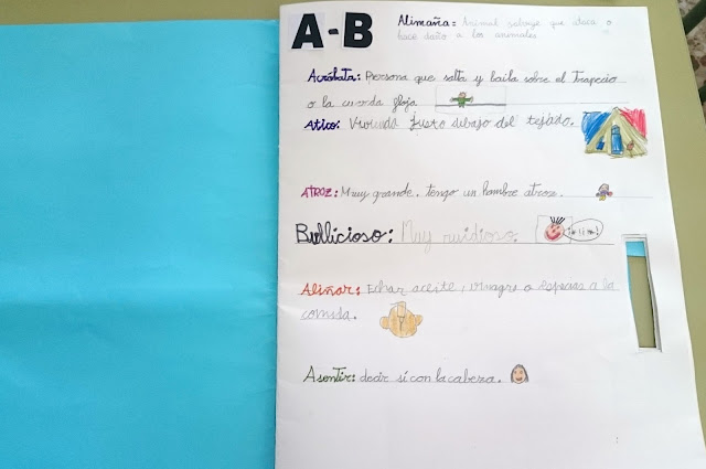 Además de consultarlo y observar qué letras son las que más palabras tenían u otras como X, Y, Z no tienen ninguna palabra, también cada cierto tiempo nos servía para elegir algunas palabras a final de la semana y elaborar un cuento ese fin de semana en casa con las mismas, desarrollando la expresión escrita.