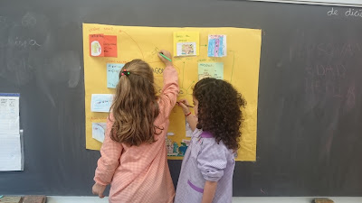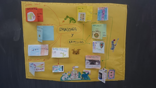 Y luego, de nuevo por parejas, cada uno trabajó un aspecto y lo pegamos en nuestro mural de fin de proyecto, con un mapa conceptual que resume lo que hemos trabajado.
