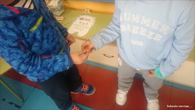 En la segunda lectura del cuento, yo me quedo en silencio y ellos son los que dicen gracias y de nada. Después por parejas hemos dado una galleta a nuestro compañero practicando: gracias y de nada.