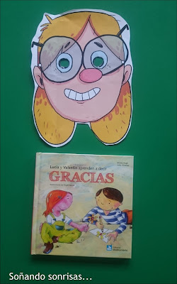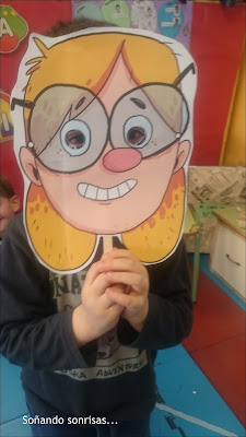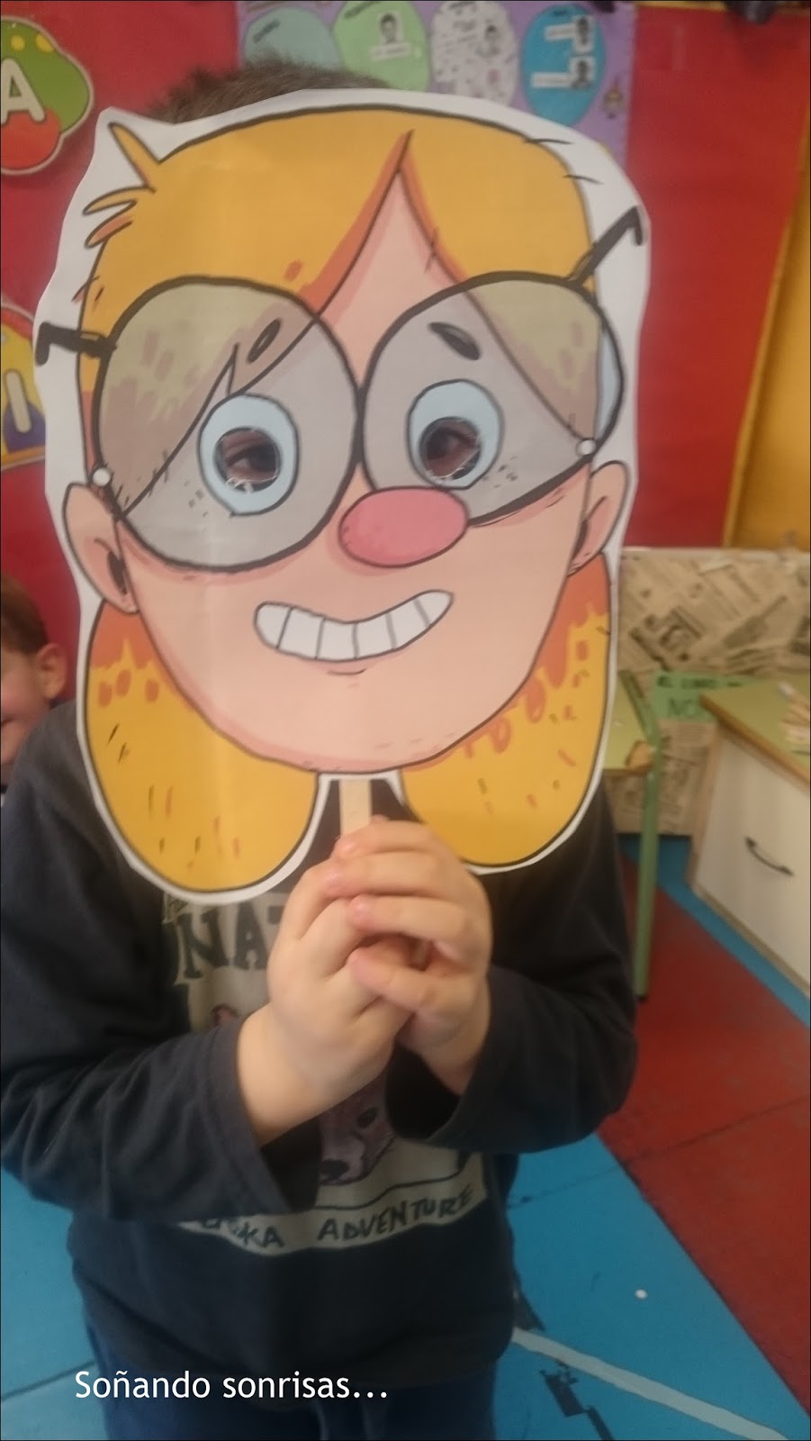 En el paquete de Boolino también venía una máscara como la que aparece en la foto, como se parece a la protagonista del cuento la hemos colocado en el Rincón de la Biblioteca para que puedan «disfrazarse» de Lucía.