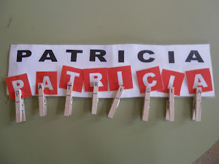 Una actividad para esto, es buscar las palabras que contiene su nombre y pegarlas con velcro y, más tarde, poner las correspondientes pinzas. (Las pinzas les gustan bastante)